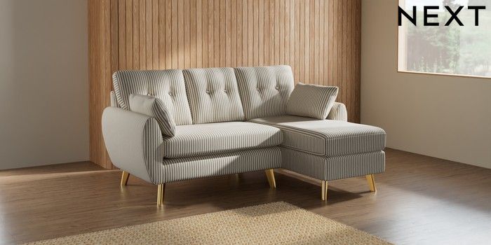 7.2.10 Buy Wilson Buttoned Back Small Sofa Chaise - Right Hand Chenille Stripe Moss Green Metal Tapered - Gold from the Next UK online shop Click here to use our accessible website