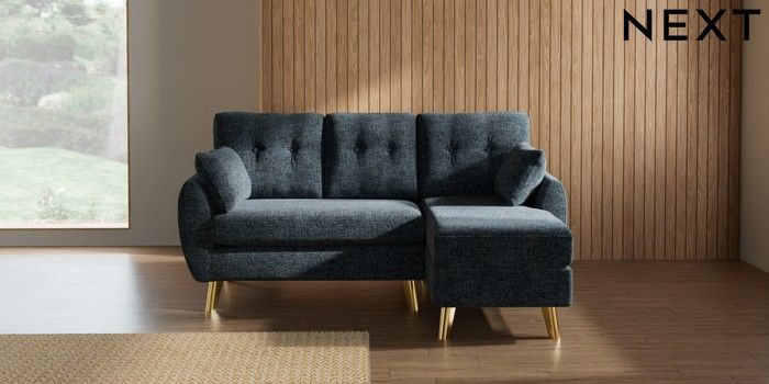 7.3.1 Buy Wilson Buttoned Back Small Sofa Chaise - Right Hand Chunky Chenille Dark Navy Blue Metal Tapered - Gold from the Next UK online shop Click here to use our accessible website