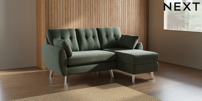 7.2.10 Buy Wilson Buttoned Back Small Sofa Chaise - Right Hand Chunky Texture Mid Forest Green Metal Tapered - Chrome from the Next UK online shop Click here to use our accessible website