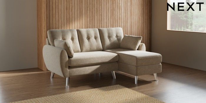7.2.10 Buy Wilson Buttoned Back Small Sofa Chaise - Right Hand Chunky Weave Cream Metal Tapered - Chrome from the Next UK online shop Click here to use our accessible website