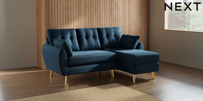 7.3.1 Buy Wilson Buttoned Back Small Sofa Chaise - Right Hand Cotswold Chenille Dark Blue Metal Tapered - Gold from the Next UK online shop Click here to use our accessible website