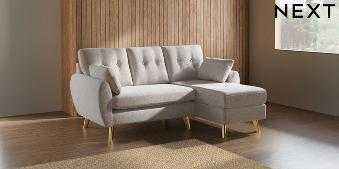 7.2.6 Buy Wilson Buttoned Back Small Sofa Chaise - Right Hand Multi Weave Oyster Metal Tapered - Gold from the Next UK online shop Click here to use our accessible website