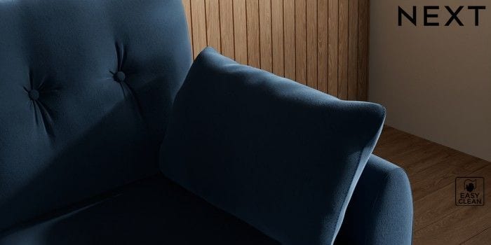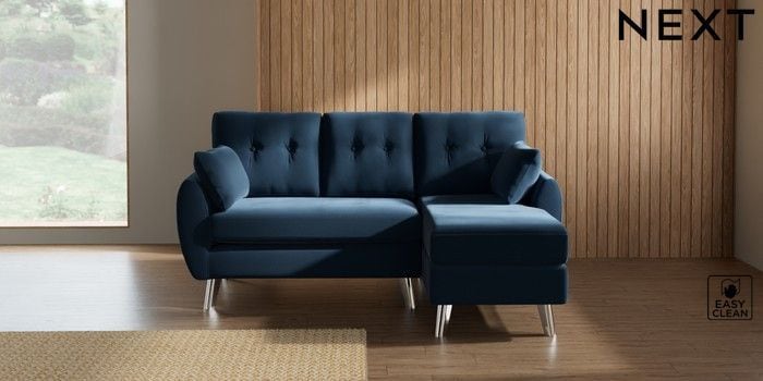 7.3.1 Buy Wilson Buttoned Back Small Sofa Chaise - Right Hand Plush Velvet Easy Clean Airforce Blue Metal Tapered - Chrome from the Next UK online shop Click here to use our accessible website
