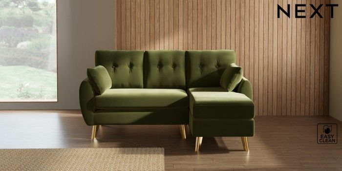 7.3.1 Buy Wilson Buttoned Back Small Sofa Chaise - Right Hand Plush Velvet Easy Clean Mid Olive Green Metal Tapered - Gold from the Next UK online shop Click here to use our accessible website