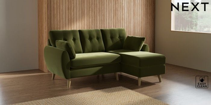 7.3.1 Buy Wilson Buttoned Back Small Sofa Chaise - Right Hand Plush Velvet Easy Clean Mid Olive Green Retro Tapered - Light from the Next UK online shop Click here to use our accessible website