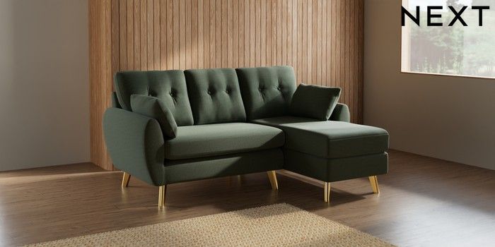 7.3.1 Buy Wilson Buttoned Back Small Sofa Chaise - Right Hand Relaxed Linen Look Dark Green Metal Tapered - Gold from the Next UK online shop Click here to use our accessible website