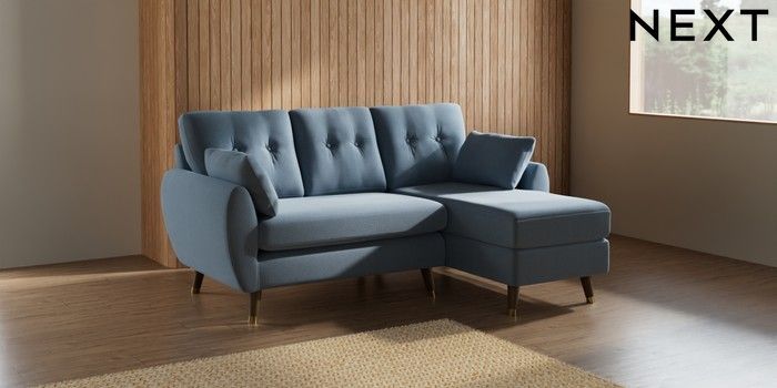 7.3.1 Buy Wilson Buttoned Back Small Sofa Chaise - Right Hand Relaxed Linen Look Mid Blue Low Retro Tapered Metal Cap - Mid from the Next UK online shop Click here to use our accessible website