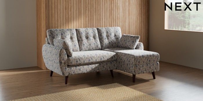 7.2.10 Buy Wilson Buttoned Back Small Sofa Chaise - Right Hand Relaxed Linen Look Print Woodblock Floral Blue Retro Tapered - Dark Brown from the Next UK online shop Click here to use our accessible website