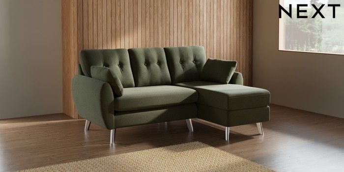 7.2.10 Buy Wilson Buttoned Back Small Sofa Chaise - Right Hand Ripple Chenille Mid Moss Green Metal Tapered - Chrome from the Next UK online shop Click here to use our accessible website