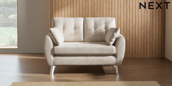 7.2.10 Buy Wilson Buttoned Back 2 Seater Small Sofa Plush Chenille Oyster Metal Tapered - Chrome from the Next UK online shop Click here to use our accessible website