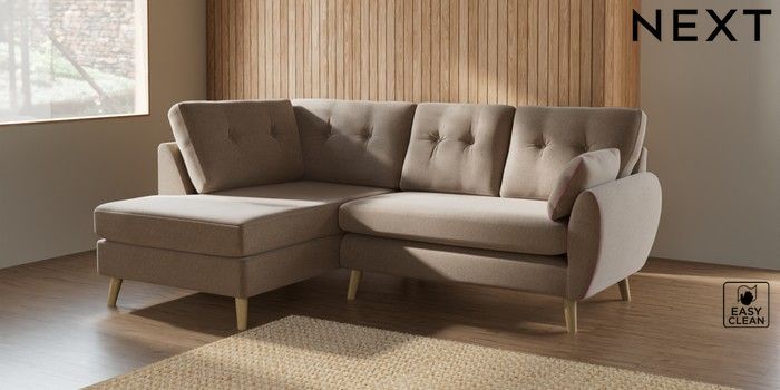 7.2.10 Buy Wilson Buttoned Back Medium Corner Chaise - Left Hand Tweedy Blend Easy Clean Light Dove Natural Retro Tapered - Light from the Next UK online shop Click here to use our accessible website
