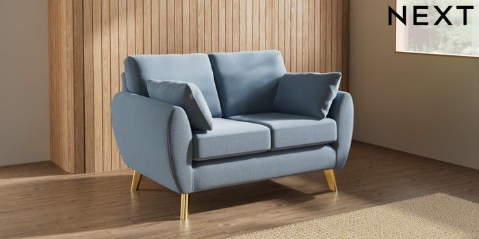 7.3.1 Buy Wilson 2 Seater Small Sofa Relaxed Linen Look Mid Blue Metal Tapered - Gold from the Next UK online shop Click here to use our accessible website