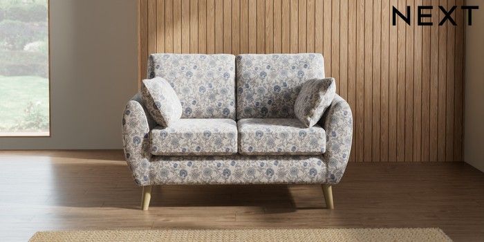 7.2.10 Buy Wilson 2 Seater Small Sofa Relaxed Linen Look Print Woodblock Floral Blue Retro Tapered - Light from the Next UK online shop Click here to use our accessible website