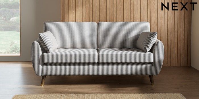 7.2.10 Buy Wilson 3 Seater Small Sofa Chenille Stripe Slate Blue Low Retro Tapered Metal Cap - Mid from the Next UK online shop Click here to use our accessible website