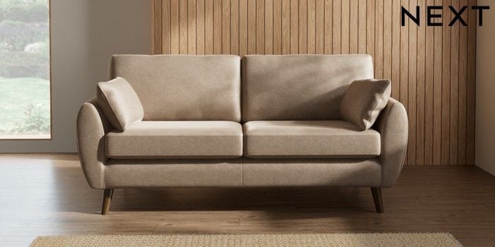 7.2.10 Buy Wilson 3 Seater Small Sofa Luxe Chenille Mid Camel Beige Retro Tapered - Mid from the Next UK online shop Click here to use our accessible website