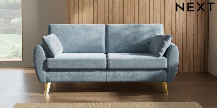 7.2.6 Buy Wilson 3 Seater Small Sofa Plush Chenille Light Blue Metal Tapered - Gold from the Next UK online shop Click here to use our accessible website
