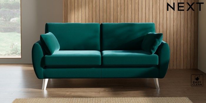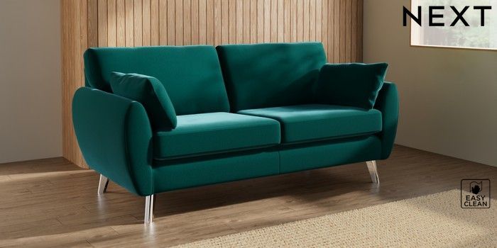 7.3.1 Buy Wilson 3 Seater Small Sofa Plush Velvet Easy Clean Juniper Green Metal Tapered - Chrome from the Next UK online shop