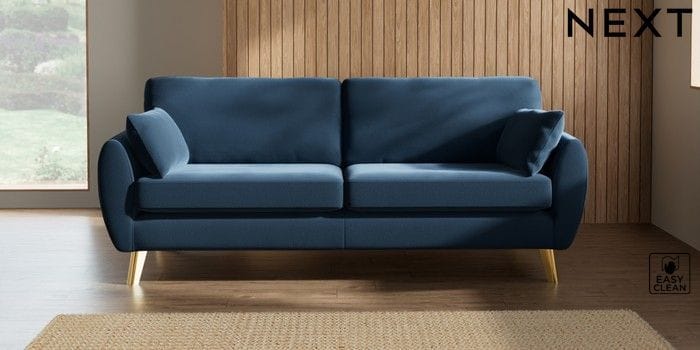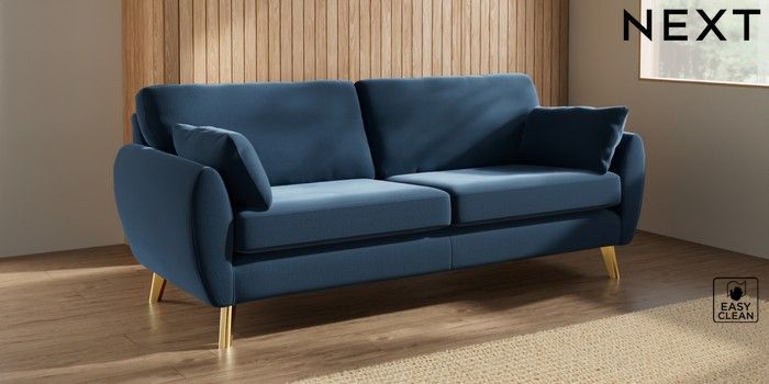 7.3.1 Buy Wilson 3 Seater Sofa Plush Velvet Easy Clean Airforce Blue Metal Tapered - Gold from the Next UK online shop Click here to use our accessible website