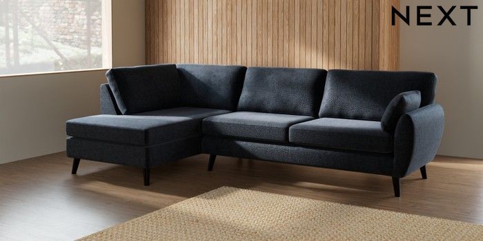 7.3.1 Buy Wilson Large Corner Chaise - Left Hand Boucle Chenille Dark Slate Blue Retro Tapered - Dark from the Next UK online shop