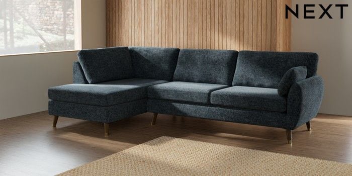 7.3.1 Buy Wilson Large Corner Chaise - Left Hand Chunky Chenille Dark Navy Blue Low Retro Tapered Metal Cap - Mid from the Next UK online shop