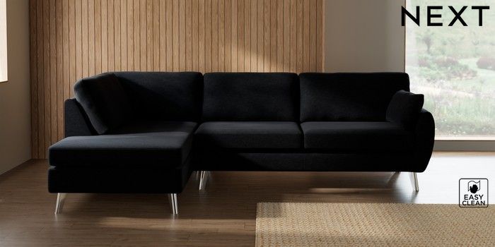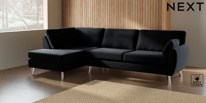 7.3.1 Buy Wilson Large Corner Chaise - Left Hand Fine Chenille Easy Clean Black Metal Tapered - Chrome from the Next UK online shop