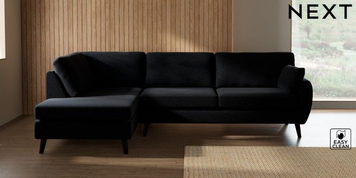 7.3.1 Buy Wilson Large Corner Chaise - Left Hand Fine Chenille Easy Clean Black Retro Tapered - Dark from the Next UK online shop