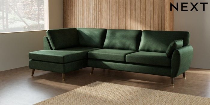 7.3.1 Buy Wilson Large Corner Chaise - Left Hand Luxe Chenille Dark Green Low Retro Tapered Metal Cap - Mid from the Next UK online shop