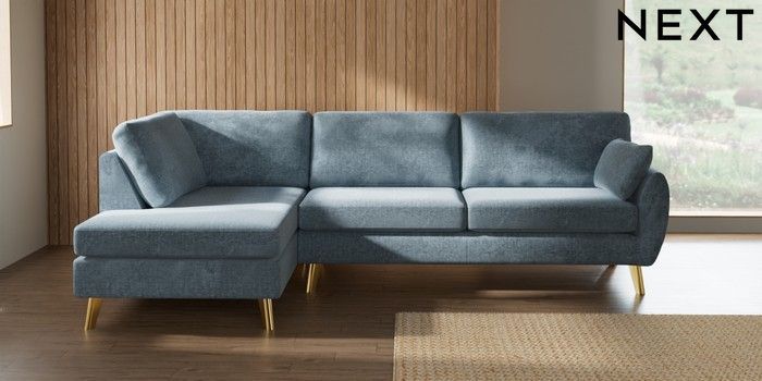 7.3.1 Buy Wilson Large Corner Chaise - Left Hand Plush Chenille Light Blue Metal Tapered - Gold from the Next UK online shop