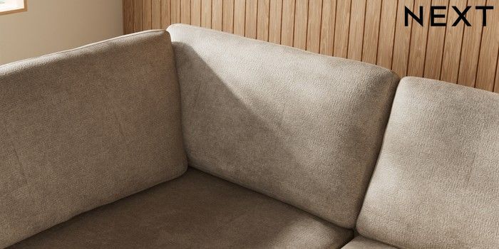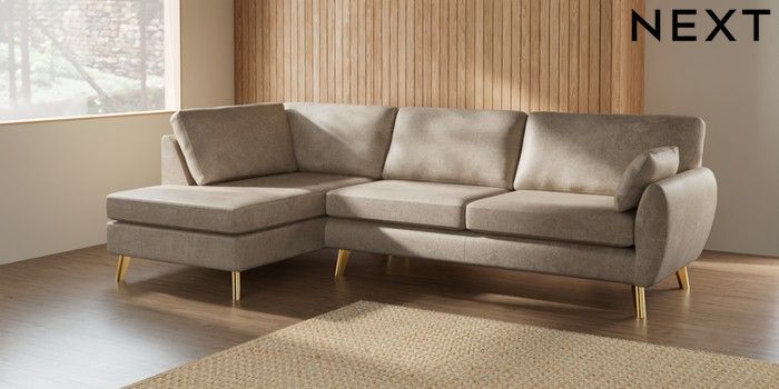 7.3.1 Buy Wilson Large Corner Chaise - Left Hand Plush Chenille Light Natural Metal Tapered - Gold from the Next UK online shop