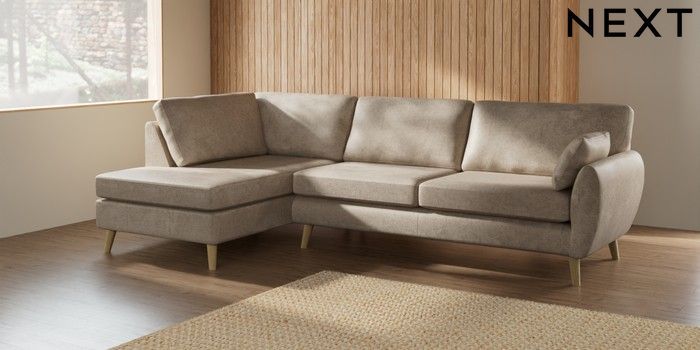 7.2.10 Buy Wilson Large Corner Chaise - Left Hand Plush Chenille Light Natural Retro Tapered - Light from the Next UK online shop Click here to use our accessible website