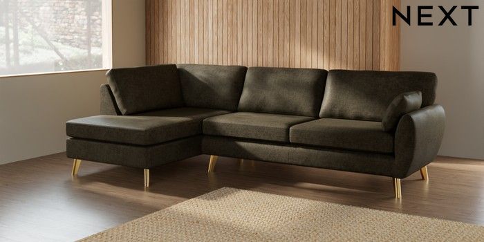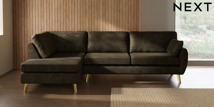 7.3.1 Buy Wilson Large Corner Chaise - Left Hand Plush Chenille Moss Green Metal Tapered - Gold from the Next UK online shop