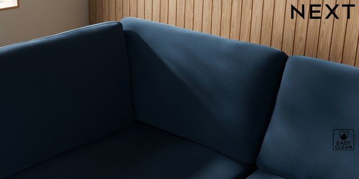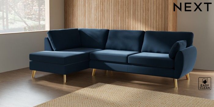 7.3.1 Buy Wilson Large Corner Chaise - Left Hand Plush Velvet Easy Clean Airforce Blue Metal Tapered - Gold from the Next UK online shop