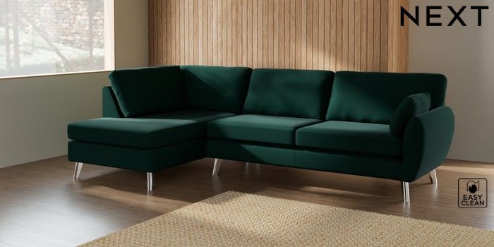 7.3.1 Buy Wilson Large Corner Chaise - Left Hand Plush Velvet Easy Clean Bottle Green Metal Tapered - Chrome from the Next UK online shop