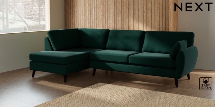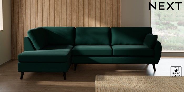 7.3.1 Buy Wilson Large Corner Chaise - Left Hand Plush Velvet Easy Clean Bottle Green Retro Tapered - Dark from the Next UK online shop