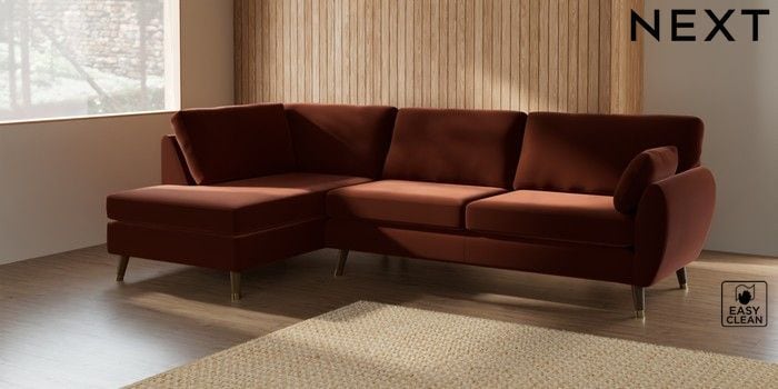 7.3.1 Buy Wilson Large Corner Chaise - Left Hand Plush Velvet Easy Clean Ginger Orange Low Retro Tapered Metal Cap - Mid from the Next UK online shop