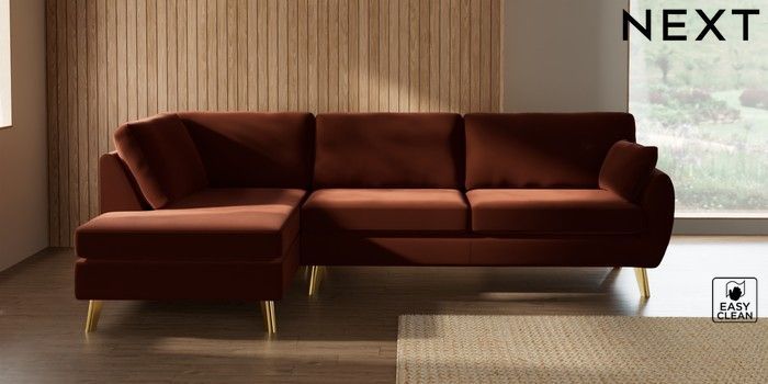 7.3.1 Buy Wilson Large Corner Chaise - Left Hand Plush Velvet Easy Clean Ginger Orange Metal Tapered - Gold from the Next UK online shop