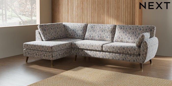 7.2.10 Buy Wilson Large Corner Chaise - Left Hand Relaxed Linen Look Print Woodblock Floral Blue Low Retro Tapered Metal Cap - Mid from the Next UK online shop Click here to use our accessible website