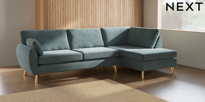 7.3.1 Buy Wilson Large Corner Chaise - Right Hand Chunky Chenille Light Teal Green Metal Tapered - Gold from the Next UK online shop Click here to use our accessible website