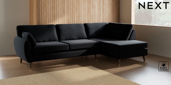 7.3.1 Buy Wilson Large Corner Chaise - Right Hand Fine Chenille Easy Clean Black Low Retro Tapered Metal Cap - Mid from the Next UK online shop