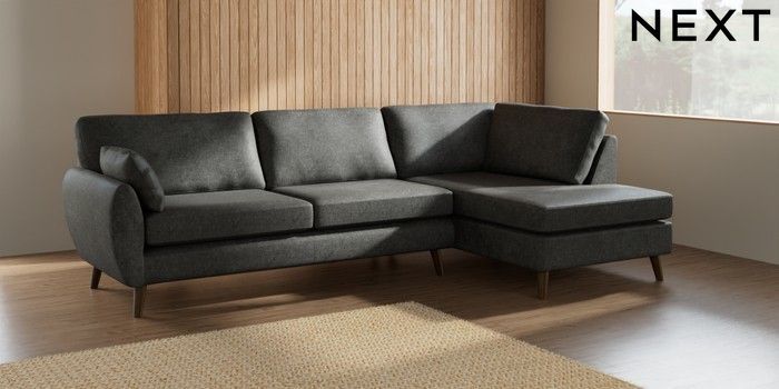 7.2.10 Buy Wilson Large Corner Chaise - Right Hand Plush Chenille Dark Grey Retro Tapered - Mid from the Next UK online shop Click here to use our accessible website