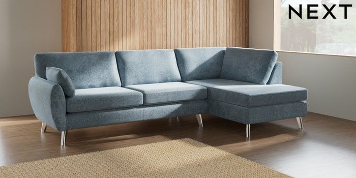 7.2.6 Buy Wilson Large Corner Chaise - Right Hand Plush Chenille Light Blue Metal Tapered - Chrome from the Next UK online shop Click here to use our accessible website