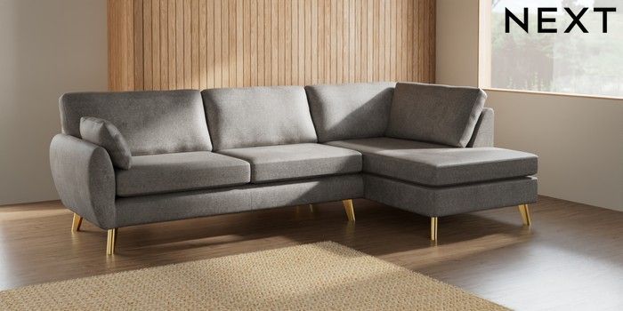 7.3.1 Buy Wilson Large Corner Chaise - Right Hand Plush Chenille Light Grey Metal Tapered - Gold from the Next UK online shop