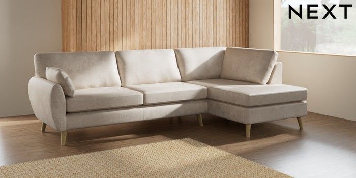 7.2.10 Buy Wilson Large Corner Chaise - Right Hand Plush Chenille Oyster Retro Tapered - Light from the Next UK online shop Click here to use our accessible website