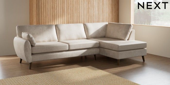 7.2.10 Buy Wilson Large Corner Chaise - Right Hand Plush Chenille Oyster Retro Tapered - Mid from the Next UK online shop Click here to use our accessible website
