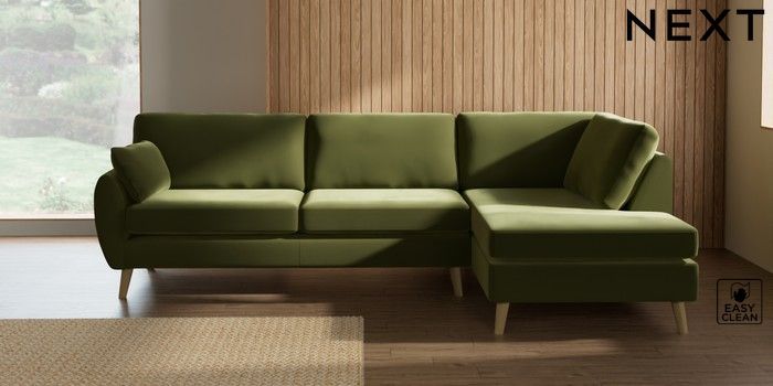 7.3.1 Buy Wilson Large Corner Chaise - Right Hand Plush Velvet Easy Clean Mid Olive Green Retro Tapered - Light from the Next UK online shop