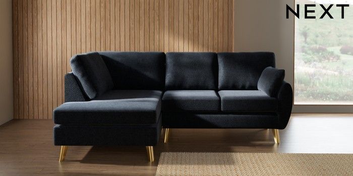 7.3.1 Buy Wilson Medium Corner Chaise - Left Hand Boucle Chenille Dark Slate Blue Metal Tapered - Gold from the Next UK online shop