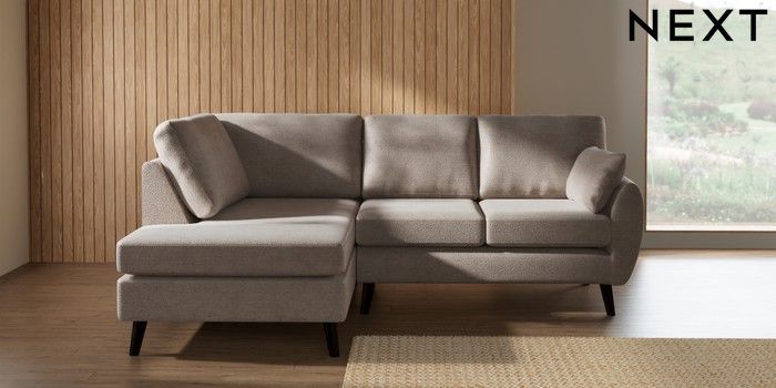 7.3.1 Buy Wilson Medium Corner Chaise - Left Hand Boucle Chenille Light Natural Retro Tapered - Dark from the Next UK online shop