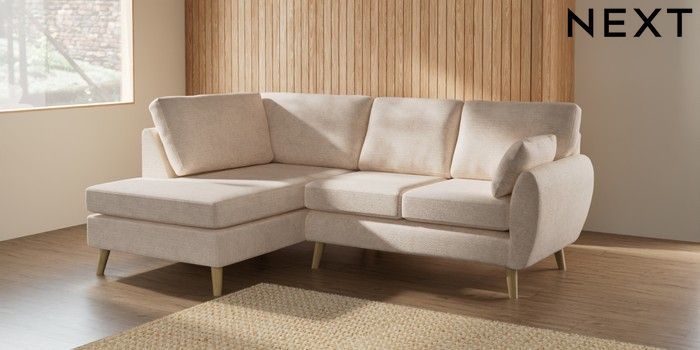 7.2.10 Buy Wilson Medium Corner Chaise - Left Hand Boucle Chenille Oyster Retro Tapered - Light from the Next UK online shop Click here to use our accessible website