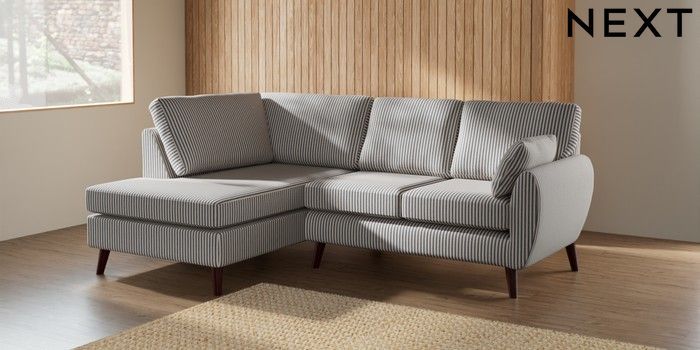 7.2.10 Buy Wilson Medium Corner Chaise - Left Hand Chenille Stripe Slate Blue Retro Tapered - Dark Brown from the Next UK online shop Click here to use our accessible website