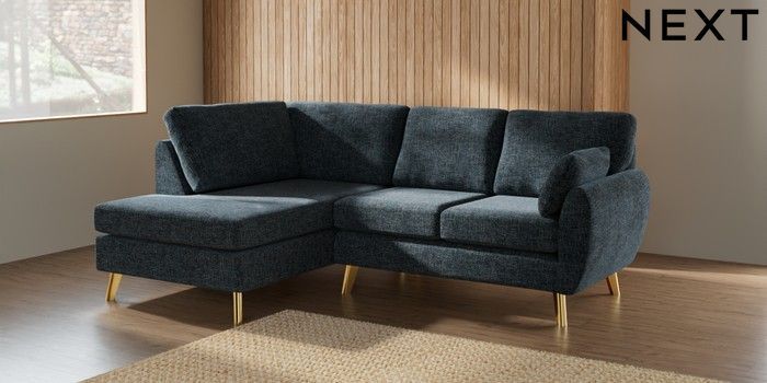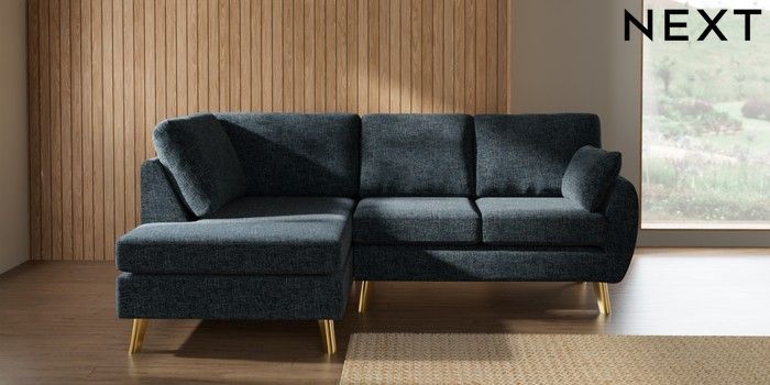7.3.1 Buy Wilson Medium Corner Chaise - Left Hand Chunky Chenille Dark Navy Blue Metal Tapered - Gold from the Next UK online shop Click here to use our accessible website